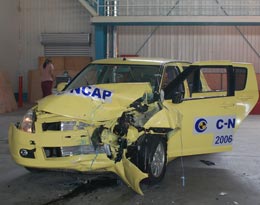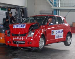 第二天的試驗(yàn)仍舊是側(cè)面碰撞,與歐洲等地銷售的原型Swift相比,國內(nèi)的雨燕沒有裝備側(cè)面安全氣囊或氣簾。這是國內(nèi)目前整體安全裝備水平?jīng)Q定的,不要說像雨燕這樣經(jīng)濟(jì)型轎車,即便是更高一級(jí)的轎車也未必能擁有側(cè)氣囊。但我說這番話并非認(rèn)同經(jīng)濟(jì)型轎車沒有側(cè)氣囊就可以理直氣壯,而是希望像C-NCAP這樣的公開碰撞試驗(yàn)?zāi)鼙M快地推動(dòng)國內(nèi)車輛安全標(biāo)準(zhǔn)的提升。