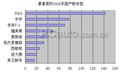 最喜歡的2002年國產新車不出意外POLO奪得冠軍,亮麗的外觀和較高的性價比是Polo的殺手锏。中華以氣派的外觀排到了第二位。