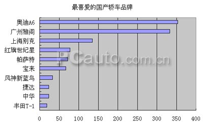 最喜歡的國產中檔轎車,奧迪A6和廣本雅閣排到了前兩位,品牌效應深入人心。